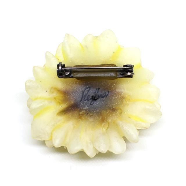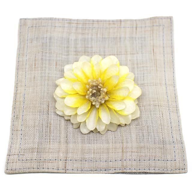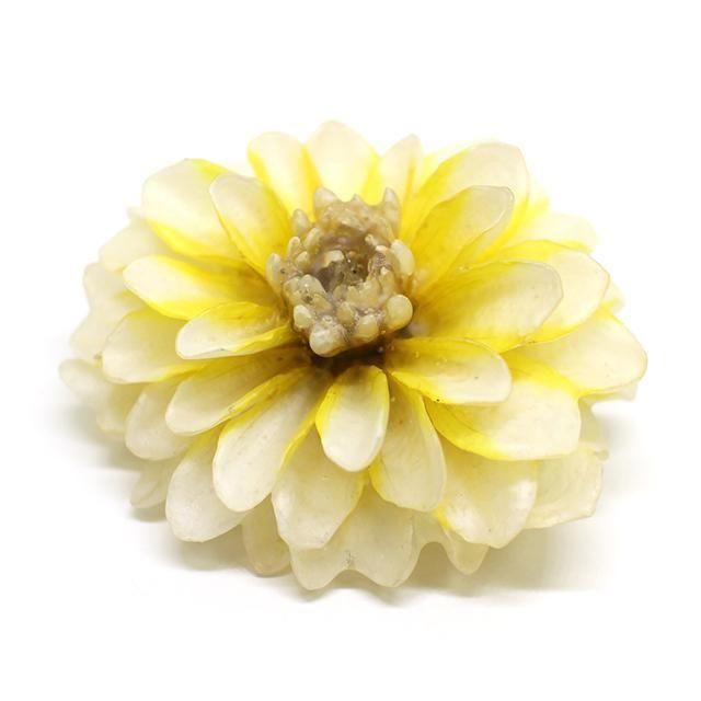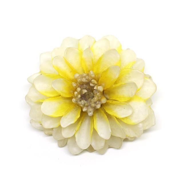 白い花びらに鮮やかな黄色の入ったダリアのブローチです。